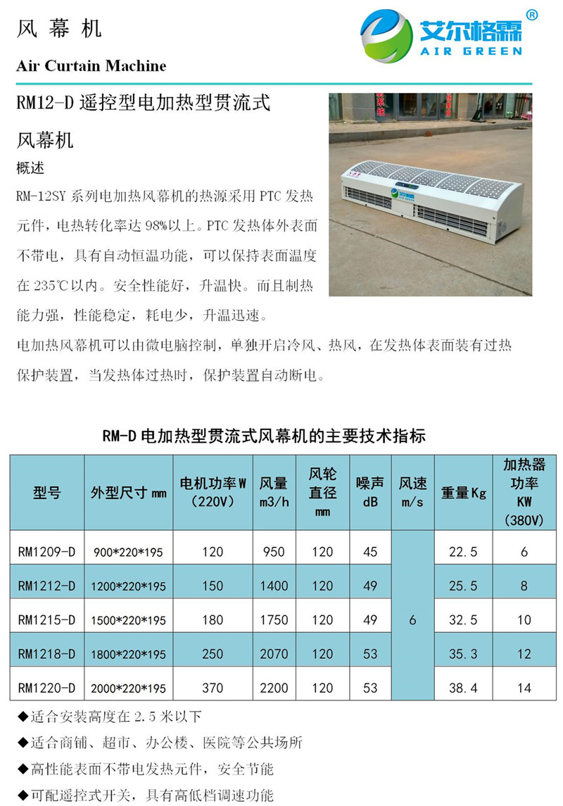 RM-D系列電加熱風(fēng)幕機(jī)的熱源采用PTC發(fā)熱元件,電熱轉(zhuǎn)化率達(dá)98%以上。PTC發(fā)熱體外表面不帶電,具有自動(dòng)恒溫功能,可以保持表面溫度在235℃以?xún)?nèi)。安全性能好,升溫快。而且制熱能力強(qiáng),性能穩(wěn)定,耗電少,升溫迅速。