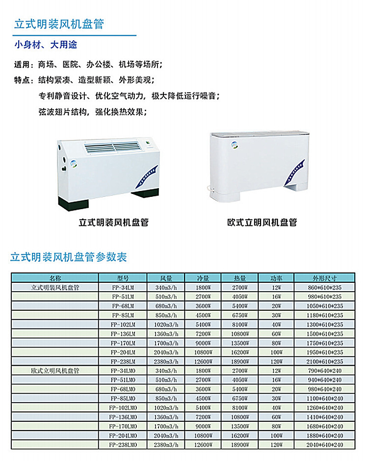FP-LM立式明裝風(fēng)機(jī)盤管是專為辦公室、家庭、別墅、餐廳、門店等場所推出的一種新型風(fēng)機(jī)盤管。它的機(jī)外靜壓為30Pa,設(shè)計(jì)風(fēng)量為340m3/h—2380 m3/h。額定冷量為2-13KW,額定熱量為3.2-20KW,單臺適用于13-90平米的房間。立式明裝盤管表面采用靜電噴涂處理,色彩高雅,外形美觀,可直接置于室內(nèi)地板上,與室內(nèi)裝飾匹配,拆裝保養(yǎng)容易,性能可靠。送風(fēng)口按照客戶需要可以制作成頂送風(fēng)和側(cè)送風(fēng)兩種,送風(fēng)口為雙層格珊式百葉,送風(fēng)角度可調(diào)節(jié),機(jī)組上標(biāo)配強(qiáng)、中、弱三檔調(diào)速開關(guān),也可以根據(jù)需要選配液晶溫控器。