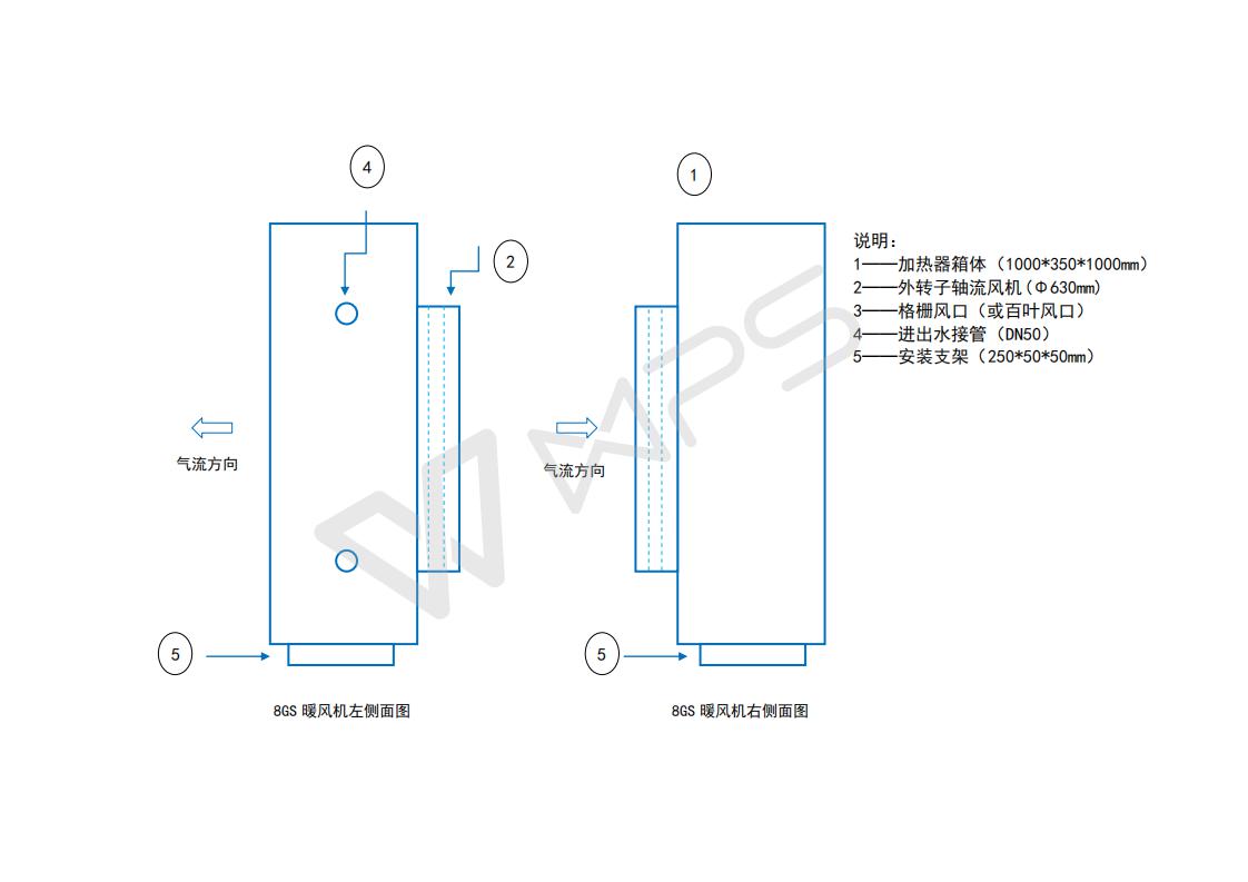 8GS熱水暖風(fēng)機(jī)的外形尺寸,8GS熱水暖風(fēng)機(jī)采用4排管鋼管加熱器,外轉(zhuǎn)子軸流風(fēng)機(jī),出風(fēng)口尺寸1000*1000mm,