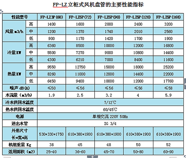“艾爾格霖”柜式水溫空調(diào)有3匹60根管、5匹72根管、5匹90根管、5匹120根管、5匹168根管\10匹90根六個(gè)規(guī)格,散熱器是直徑9.52,壁厚0.26的銅管。柜式水溫空調(diào)的適用面積,因?yàn)樗疁乜照{(diào)的額定冷量小,額定熱量大,所以制冷和供熱的面積是不同的。如果夏天和冬天都要用水溫空調(diào)的用戶,要按照水溫空調(diào)的制冷量來(lái)選型。