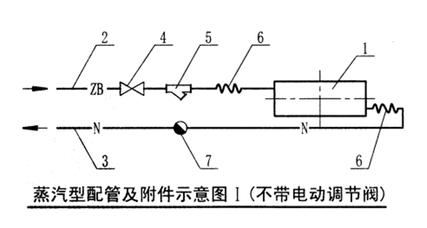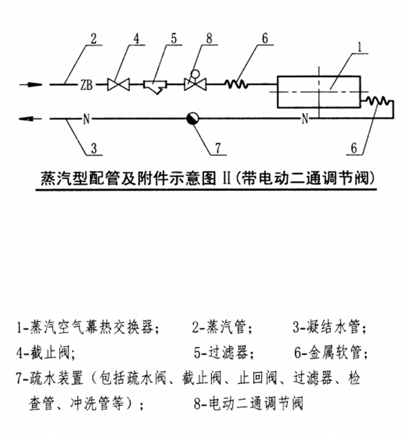 蒸汽型熱空氣幕的配管及附件見下列示意圖: