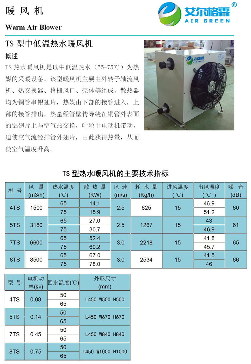 TS工業(yè)冷暖風(fēng)機是以中低溫?zé)崴?5-75℃)為熱媒的采暖設(shè)備。該型暖風(fēng)機主要由外轉(zhuǎn)子軸流風(fēng)機、熱交換器、格柵風(fēng)口、殼體等組成,散熱器均為銅管串鋁翅片,熱媒由下部的接管進入,上部的接管排出,熱量經(jīng)管壁傳導(dǎo)繞在銅管外表面的鋁翅片上與空氣熱交換,葉輪由電動機帶動,迫使空氣流經(jīng)排管外翅片,由此獲得熱量,從而使空氣溫度升高。